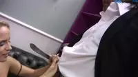 In a dimly lit storefront, the Blonde Bimbo can't help but let her eyes wander over the dazzling display of shoes.The store, filled with nothing but exquisite footwear, feels almost like a temple of desire to her.She starts browsing the racks, feeling the urge to try on some of these fabulous pairs.As she stands there, admiring the glossy leather and delicate designs, a familiar presence behind her sends shivers down her spine.The shoe salesman has been watching her for a while, his desire growing stronger with every caress of her supple skin.He approaches her, his voice low and husky, Let me help you pick the perfect shoes.He leads her to an isolated corner where he can watch her undulating body more easily as she tries on each pair.His hands reach out to her shapely legs, his fingers leaving trails of goosebumps as they explore her calves and thighs.She feels a surge of heat between her legs as her horny imagination takes over, picturing herself walking down the street in those stunning pairs, turning heads with every step.As her feet are adorned in gorgeous creations, she catches him stealing glances at her perky, round boobs peeking out from underneath her tight blouse.A fire begins to smolder within her core, as his hands inch ever closer to her wet pussy, desperate to taste her sweet nectar.His lips part in an inviting grin, silently asking if she is ready for what's to come, and she nods with eager anticipation.The shoe salesman lifts the blonde onto his desk, her legs dangling off the edge and spreading wide open for his hungry eyes to see her sweet cunt.His mouth begins to lick, suck, and tease every part of her sensitive folds until she can't take it any longer - her moans echoing throughout the shop.She watches in awe as he removes a beautifully crafted stocking from under his counter.Sliding it over her smooth skin, her desire intensifies even further.Her body undulates to meet each powerful thrust, and her heart swells as she starts to stroke his cock with eager hands.Their eyes lock, both fully aware that their climaxes are rapidly approaching.He pulls out just in time, his breath catching in his throat as he watches her lick her lips with a playful smirk.As the blonde's vision fills with an explosion of hot cumshot all over her pretty face, he can't help but let out a satisfied and spent moan himself.As they recover from their raunchy escapade, they exchange glances of appreciation, knowing this won't be the last time they share this shoe-selling fetish sex scene in his secret room at the back of his shop.With their shared fantasies ignited and satisfied, they will forever associate footwear with their intense, sizzling desire for each other.
