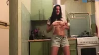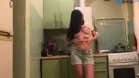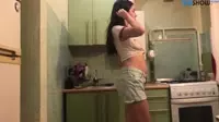 Brunette teases with striptease in the kitchen